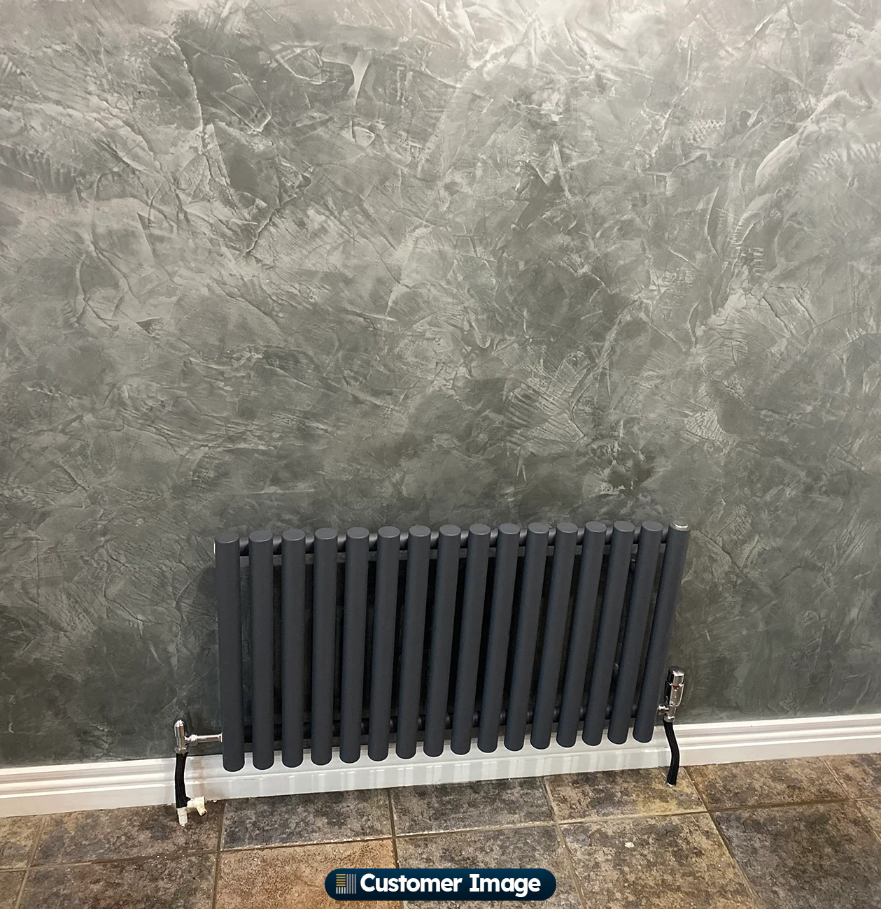 Terma aims to think differently when conceiving its radiator designs and the Rolo Room has design at its core where heat output meets aesthetic design. The 500mm high models of Rolo can only be installed with the bars running vertically (unlike other models in the range which can be installed either way up). There is an internal diverter system for your plumber to aid the water flow as required depending how it is installed. Rolo features very large internal holes where the front bare is recessed into the rear bar meaning there are very large internal holes for quick internal distribution of the water for super quick heat up times. Rolo features large, chunky 40mm diameter bars which offer a very high heat output. The Rolo Room 500mm high models offers side entry only valves (unlike the other models in this range which offer both side and underside entry). The Modern Grey colour is a dark grey perfect for a mood inspired bathroom and has a matt, rough textured finish. Rolo is part of a unique family of products where you can buy matching radiators (electric and central heating), mirror radiators and towel rails.