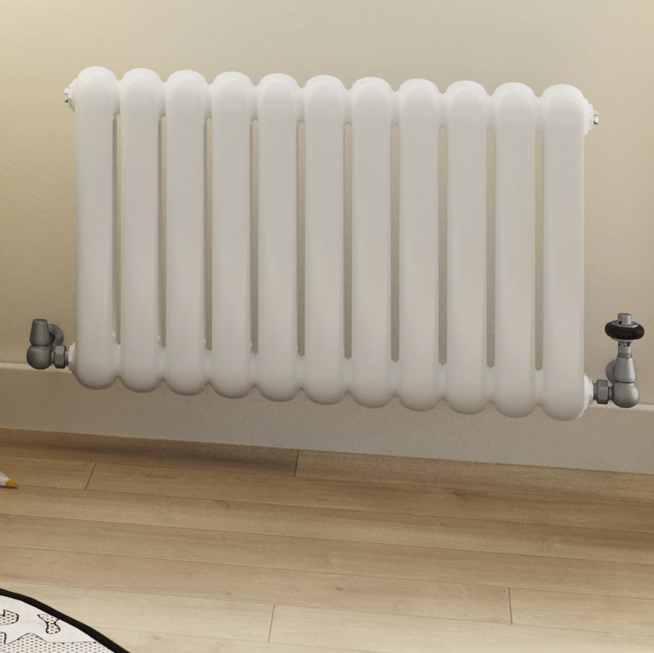 Pipework bends up to side connections but the valve sits in front of the radiator—though in this case, angled valves may be more discreet.